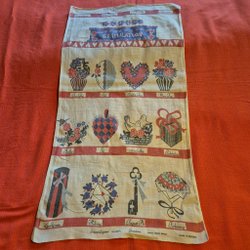 Retro frottéhanddukar 6 st 50-60 tal med mönster i gult, blått, grönt , rosa och grått samt märkt med ett M . bredd 45 cm längd 62cm , på en av handukarna finns en liten fläck se bild 1.