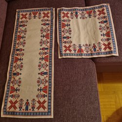 Två virkade grytlappar i blått och vitt. Bomull. Olika mönster på fram och baksida. Ca 13 x 123 cm. Bra skick.