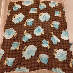 Ett vackert tyg med blommigt mönster i blå och rosa toner. Jag tror att det är någon slags satin? Tyget är väldigt tunt, lätt, glansigt och glatt. Passar till mycket t.ex. en blus, scarf, nattlinne, som foder i en jacka eller väska... Bara fantasin sätter gränser!