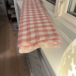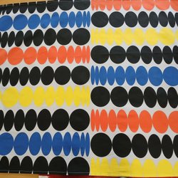 Rutigt bomullstyg i svart, vitt, blått, gult och grönt. Håller form och färg. Har sytt små barnbyxor tidigare av detta tyget.