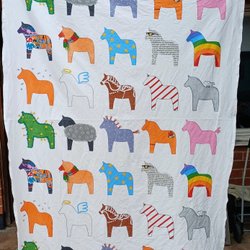 Mycket festligt och unikt tyg där det färgglada mönstret består av dansande figurer i rött, gult och blått. Mönstret har klara färger och har en hög kontrast mellan mösterformerna. 3 lika stora tygstycken 50x147cm