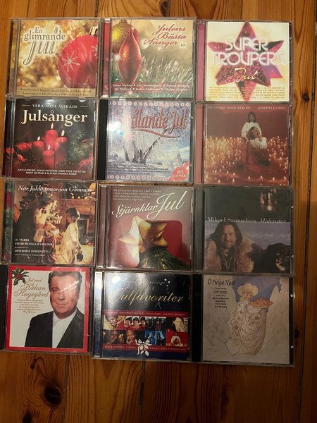 En samling jul-CDs med diverse artister och julmusik. Perfekt för julstämningen! 12 st svenska cd med kända artister