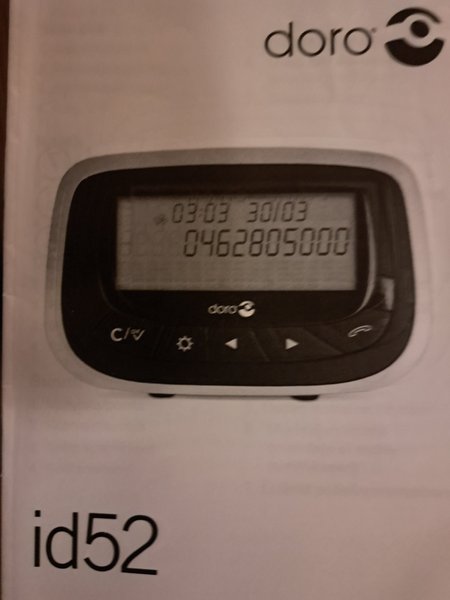 Doro id52 är en telefon med en tydlig display som visar tid, datum och telefonnummer. Den har knappar för att navigera i menyn och en knapp för att svara på samtal.