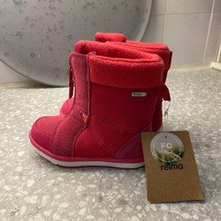 Ett par röda vinterstövlar. Perfekt för kalla och snöiga dagar. De har dragsko upptill för att hålla snön ute.