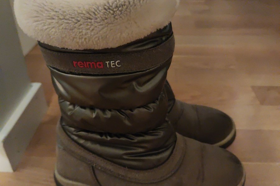 Ett par grå/silvriga vinterstövlar från Reima TEC. Stövlarna har en ljusare kant upptill.