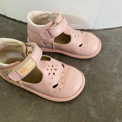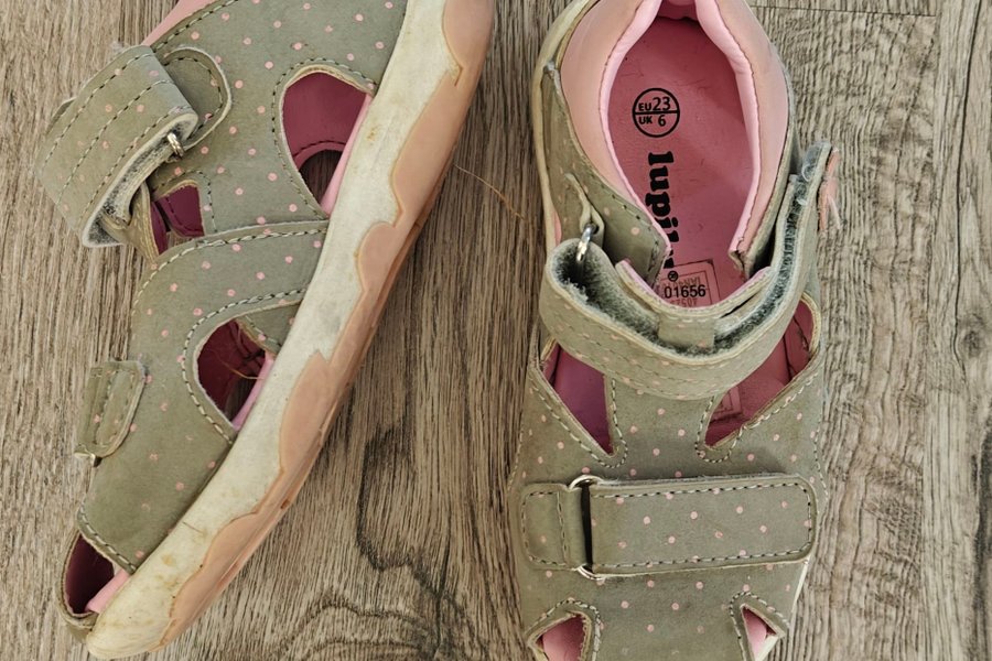 Sandaler med kardborreknäppning för enkel justering. Skorna har en öppen tå och utskurna detaljer på sidorna. Insidan är fodrad i rosa och utsidan är grå med rosa prickar.