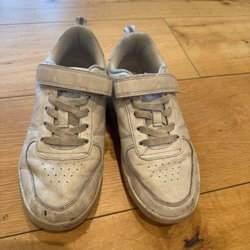 Ett par vita sneakers med kardborreband och snörning. Skorna har en enkel design med en slät ovandel och en randig detalj på hälen.