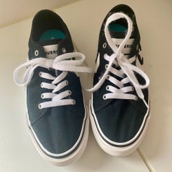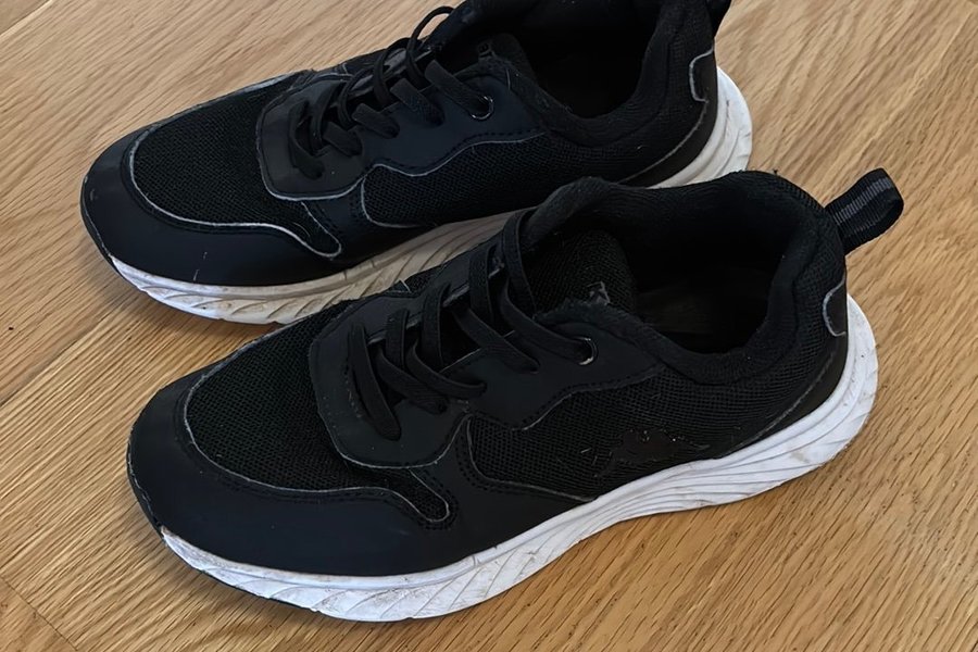 Svarta sneakers med vita sulor. Skorna har snörning framtill och en dragflik baktill för enklare påtagning.