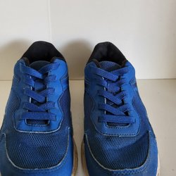 Ett par sportskor från EXANI i blått. Skorna har kardborreband för enkel justering och är märkta som vattentäta. De har en robust sula och är lämpliga för utomhusaktiviteter.