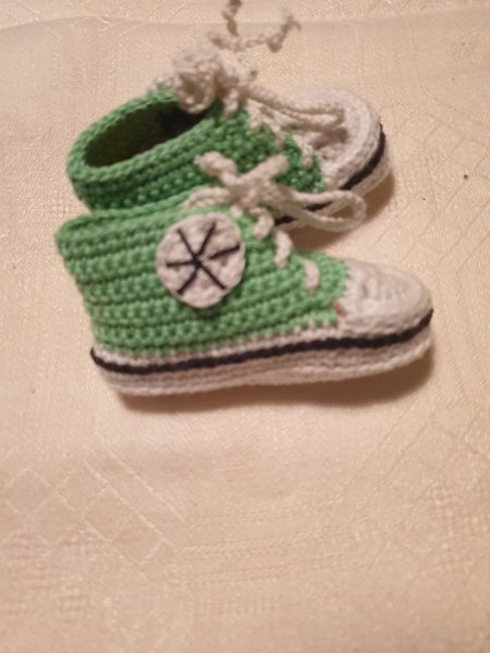 Ett par virkade babyskor i grönt och vitt med vita skosnören. Skorna har en liten svart och vit detalj på sidan. Sulans längd 9,5 cm. Dessa är virkade i bomullsgarn.