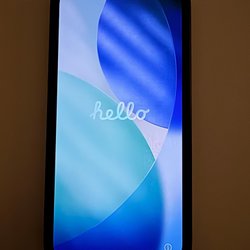 Kommer med kartong och sladd. Observera att det finns en liten spricka längst ner i högra hörnan se på bild.