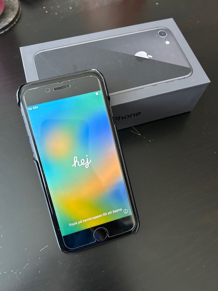 iPhone 8 i färgen rymdgrå. Telefonen har en 4,7-tums Retina HD-skärm och drivs av ett A11 Bionic-chip. Den har en 12 MP kamera på baksidan och en 7 MP FaceTime HD-kamera på framsidan. Telefonen har Touch ID för säker autentisering.
