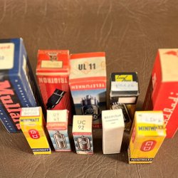 Ett sortiment av elektronrör inklusive märken som Mullard AZ31, Telefunken PL 504, Philips Miniwatt, GE 35W4, Tungsram EF93, Raytheon 6SA7 och Triot EAF42. EC90 , 7C5 . UCH11. EBC90
