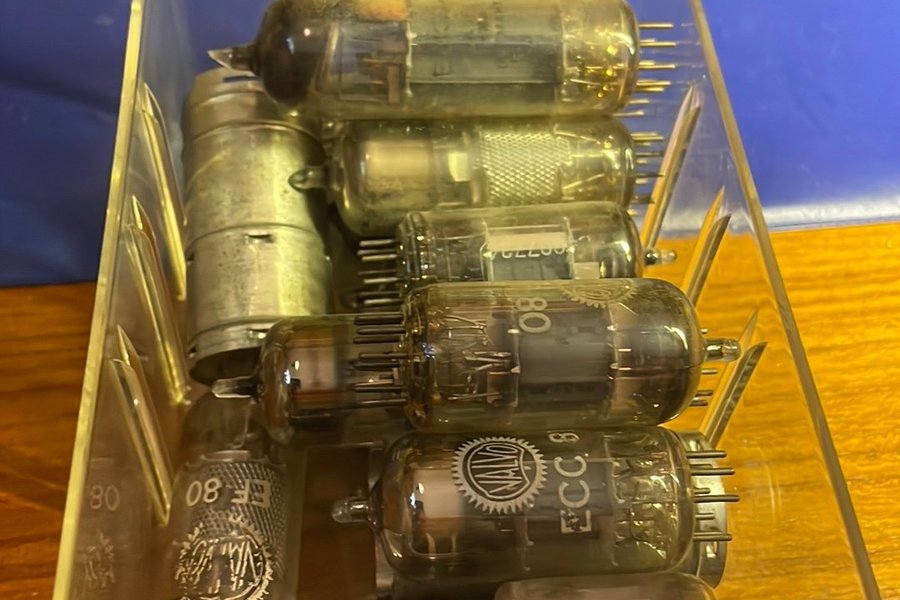 Ett parti med elektronrör, inklusive modeller som EF80 och ECC88. Rören är av olika typer och storlekar.