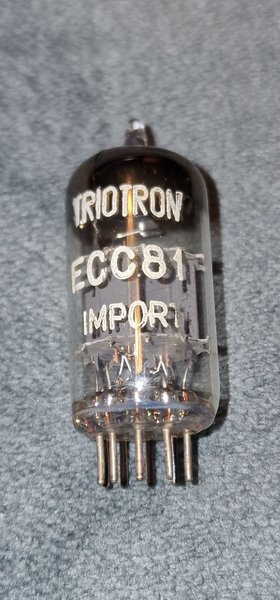 Elektronrör av modellen ECC81 från tillverkaren Triotron. Märkt med "IMPORT".