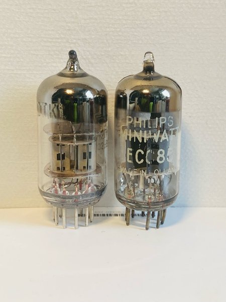 Ett Philips Miniwatt ECC85 rör och ett Philips Miniwatt ECC83 rör. Båda rören är tillverkade i Holland.