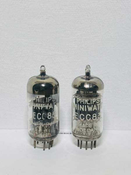 Ett Philips Miniwatt ECC85 rör och ett Philips Miniwatt ECC83 rör. Båda rören är tillverkade i Holland.