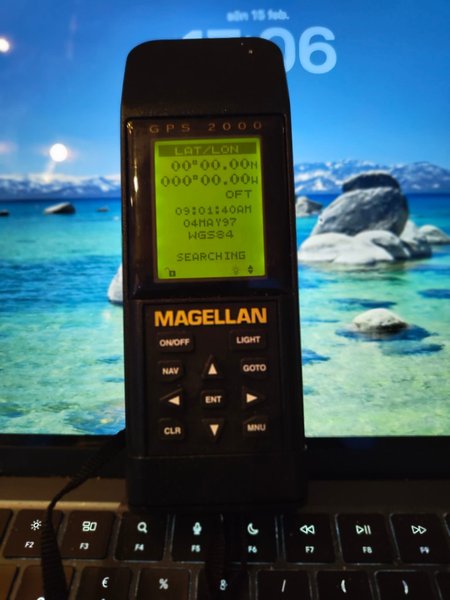 Klassisk Magellan GPS 2000. Enheten visar latitud/longitud, tid och datum. Den har knappar för på/av, navigering, ljus, GOTO, rensa och meny. Ett samlarobjekt