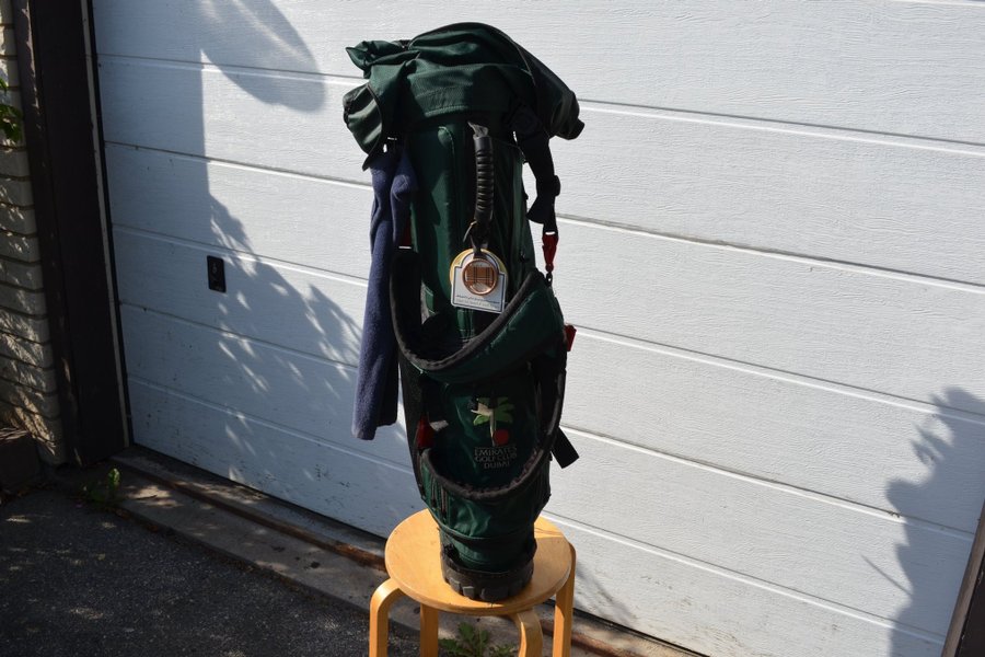 Grön standbag med logotyp från Emirates Golf Club Dubai. Bagen har flera fack, toppförslutning och bärsele
