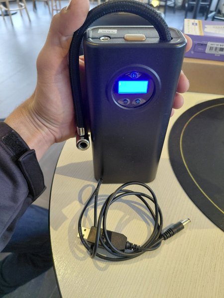 Denna bärbara luftpump är utrustad med en digital display för enkel avläsning. Den kompakta designen gör den smidig att ta med sig. En laddningskabel medföljer.