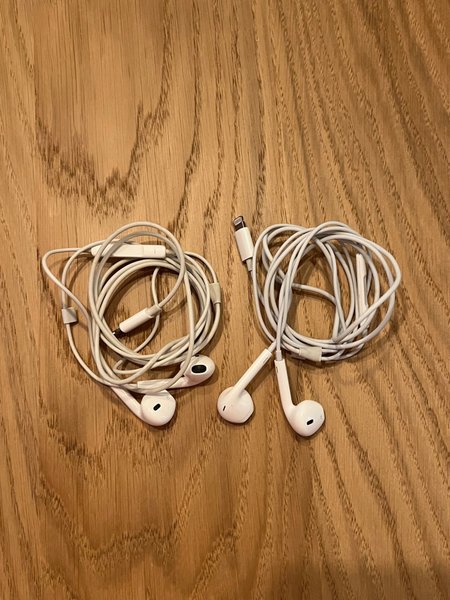 Två par vita trådbundna hörlurar i gott begagnat skick. Ett par med Lightning-kontakt och ett par med 3,5 mm-kontakt. Båda fungerar utan kända problem och har normal användningsslitage. Passar bra som reservhörlurar eller för vardagsbruk.