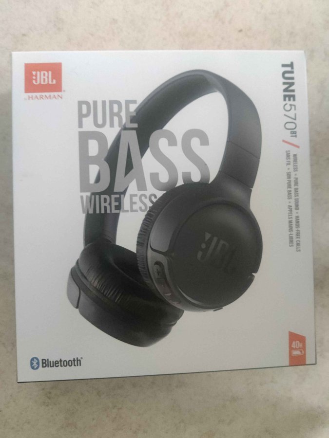 Trådlösa JBL Tune 570BT hörlurar med Pure Bass-ljud och handsfree-samtal. Batteritid upp till 40 timmar. Bluetooth.
