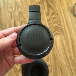 Säljer ett par hörlurar. De är svarta och har en nackbygeldesign. Hörlurarna har knappar för volymkontroll och en USB-port.