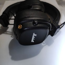 Säljer ett par hörlurar. De är svarta och har en nackbygeldesign. Hörlurarna har knappar för volymkontroll och en USB-port.