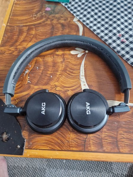 AKG trådlösa hörlurar med Bluetooth-anslutning. Hörlurarna är svarta och har AKG-logotypen på utsidan av kåporna. De är av over-ear-modell med en vadderad bygel nya öronkuddar behövs och går beställa för ca 100kr. Fullt fungerande rent ljud och bra ljud.