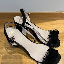 Eleganta svarta sandaler i läder från H&M. Köpta second hand på Arkivet i Stockholm, därefter aldrig använda. Storlek 41.