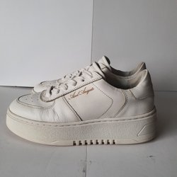 Sneakers från Converse All Star. Storlek 41, innermått ca 265 mm. Vitt skinn, ej fodrade. Bra, använt skick. Bra sulor. Nya skosnören. Rengjorda för hand, ångade och polerade med produkter från Saphir. Redo att användas igen! Jag har samfrakt 3 dagar och det är fri frakt på köp över 300 kr!