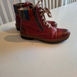 Rieker kängor med dragkedja på sidan och snörning framtill. Fodrade inuti med detaljer i olika färger.