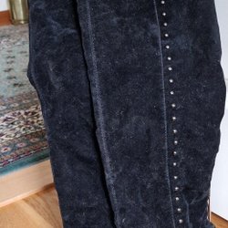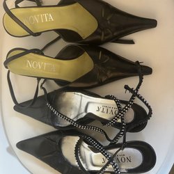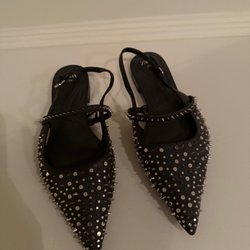 Eleganta svarta klackskor med dekorativa nitar längs remmarna. Perfekta för en utekväll eller festligare tillfällen. Stilrena och bekväma.