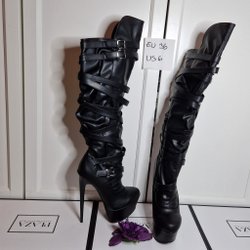 Ett par snygga svarta höga stövlar med remmar och höga klackar.