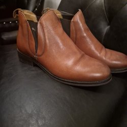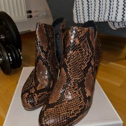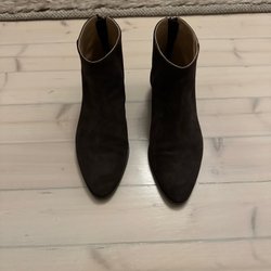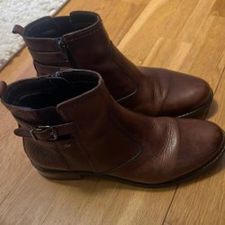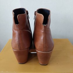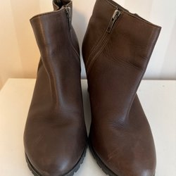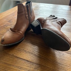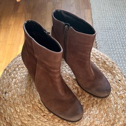 Ett par bruna ankelboots med dragkedja på sidan och en klack.