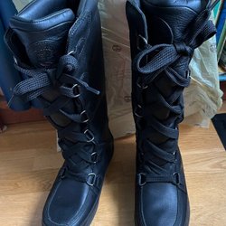 Ett par svarta höga stövlar från Timberland. Stövlarna har en robust sula med ett distinkt mönster. Perfekt för både vardag och äventyr.