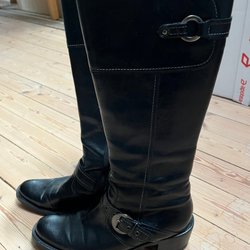 Rockiga stövlar i svart skinn med mikrofoder och 2,5 cm blockklack. Smidiga att ta på tack vare dragkedja. Väl omhändertagna och i fint skick.