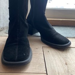 Ett par svarta ecco-stövlar med fluffigt varmt foder. De har ett mellanhögt skaft och en robust sula, lämpliga för kallare väder. Fint skick.