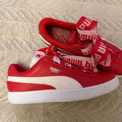 Röda sneakers med snörning. Skorna har ett vitt hjärta och EKG-linje på sidan samt vit text längs sulan. Vita detaljer finns även baktill på skorna.som nya endast testade , då dom inte passade mina fötter