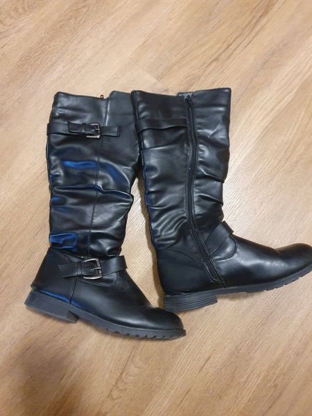 Svarta stövlar med spännen och dragkedja på sidan. Stövlarna har en platt sula och når upp till vaden.