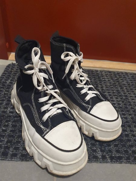 Ett par svarta platåskor med vita snören och vita sulor. Skorna har en robust design med en tjock sula som ger extra höjd. De är höga i modellen och snörningen går upp över ankeln. Skorna har vita sömmar som kontrasterar mot det svarta tyget.