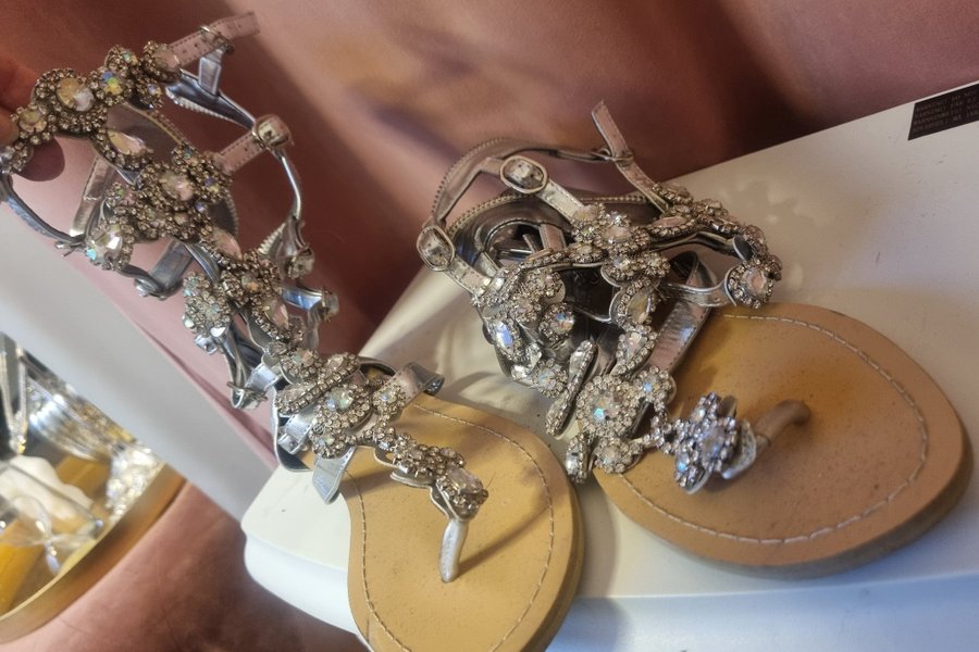 Ett par silverfärgade sandaler med strassdetaljer. Sandalerna har en tårem och remmar över foten som också är dekorerade med strass. Perfekt för festliga tillfällen eller för att piffa upp en vardagslook.