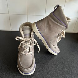 Övrigt: Gore-tex, fodrade. En lite för hårdhänt tvättning medförde att skinnet flagnat bort vid insidorna där snörningen sitter enligt bild nr 5.