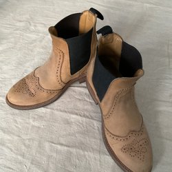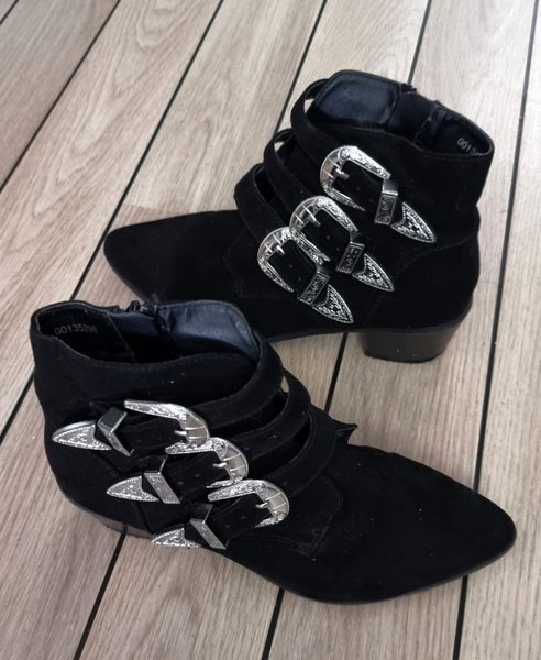 Ett par mocka boots med tuffa dekorativa spännen. Perfekt för hösten och vintern. Stilrena och bekväma. Riktigt snygga på. Strl 37. I fint skick.