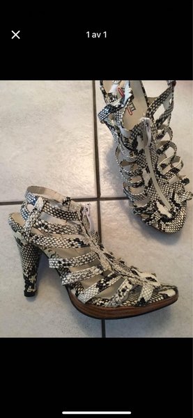 Snygga klacksandaler med ormmönster. Sandalerna har en spännande design med flera remmar och en dragkedja på sidan. Klacken är hög och elegant. Perfekta för festliga tillfällen eller som ett stiligt blickfång till en outfit.
