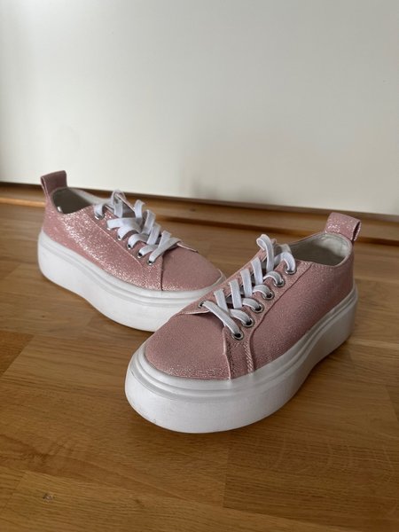 Ett par sneakers med platåsula. Skorna är i rosa glitter med vita skosnören och vita sulor. De har en dragflik baktill för enklare påtagning.