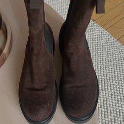 Ett par bruna boots med resårpaneler på sidorna och en dragflik baktill för enkel påtagning. Skorna har en låg klack och en rundad tå.