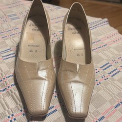 Ett par bruna pumps från Peter Kaiser med en elegant design. Skorna har en texturerad yta som liknar krokodilskinn och en dekorativ rem över foten. Klacken är stabil och ger en bekväm höjd. Insidan är märkt med Peter Kaisers logotyp. Storlek 4 på skorna. Väskan inte använd många gånger.