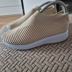 Bekväma sneakers i en neutral beige färg. Skorna har en stickad ovandel och en vit, tjock sula som ger bra dämpning. Enkla att dra på och av.