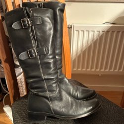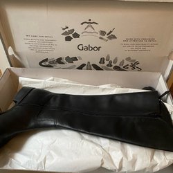 Ett par svarta stövlar med dragkedja och dekorativa detaljer.fåttt en fläck fram på foten,vågar inte gå på med rengöringsmedel.sköna o snygga i mocka på foten och nåt annat material i skaften.